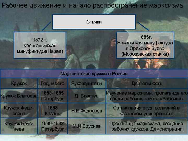 Рабочее движение и начало распространение марксизма Стачки 1885 г. Никольская мануфактура в Орехово- Зуево (Морозовская стачка) 1872 г. Кренгольмская мануфактура(Нарва) Марксистские кружки в России Кружок Год, место Руководители Деятельность Кружок Благоева 1883 -1885 Петербург Д. Благоев Изучение марксизма, пропаганда его среди рабочих, газета «Рабочий» Кружок Федосеева 1888 Казань Н. Е. Федосеев Организация студ. волнений в Казанском университете. Кружок Бруснева 1889 -1892 Петербург М. И. Бруснев Пропаганда марксизма, создание рабочих кружков. Демонстрации