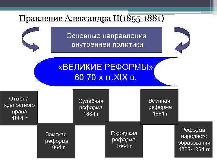 Правление Александра II(1855 -1881) Основные направления внутренней политики «ВЕЛИКИЕ РЕФОРМЫ» 60 -70 -х гг. XIX в. Отмена крепостного права 1861 г Военная реформа 1861 г Судебная реформа 1864 г Земская реформа 1864 г Городская реформа 1864 г Реформа народного образования 1863 -1964 гг