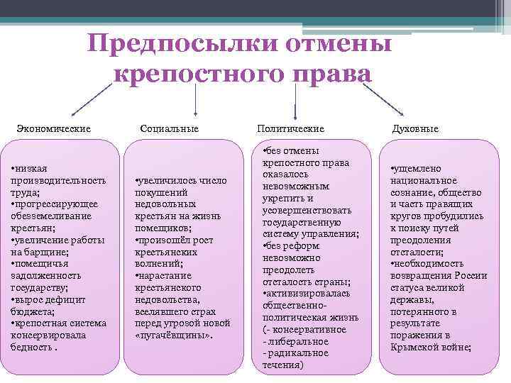 Предпосылки отмены крепостного права Экономические • низкая производительность труда; • прогрессирующее обезземеливание крестьян; • увеличение работы на барщине; • помещичья задолженность государству; • вырос дефицит бюджета; • крепостная система консервировала бедность. Социальные • увеличилось число покушений недовольных крестьян на жизнь помещиков; • произошёл рост крестьянских волнений; • нарастание крестьянского недовольства, вселявшего страх перед угрозой новой «пугачёвщины» . Политические • без отмены крепостного права оказалось невозможным укрепить и усовершенствовать государственную систему управления; • без реформ невозможно преодолеть отсталость страны; • активизировалась общественнополитическая жизнь (- консервативное - либеральное - радикальное течения) Духовные • ущемлено национальное сознание, общество и часть правящих кругов пробудились к поиску путей преодоления отсталости; • необходимость возвращения России статуса великой державы, потерянного в результате поражения в Крымской войне;