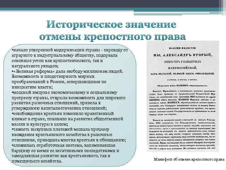 Историческое значение отмены крепостного права • начало ускоренной модернизации страны - переходу от аграрного к индустриальному обществу, подорвала основные устои как крепостнического, так и натурального укладов; • «Великая реформа» дала свободу миллионам людей. Возможность и плодотворность мирных преобразований в России, совершающихся по инициативе власти; • мощный импульс экономическому и социальному пpoгpeccy страны, открыла возможность для широкого развития рыночных отношений, привела к утверждению капиталистических отношений; • освобождение крестьян изменило нравственный климат в стране, повлияло на развитие общественной мысли и культуры в целом; • тяжесть выкупных платежей мешала процессу вхождения крестьянского хозяйства в рыночные отношения, приводила многих крестьян к обнищанию; • сложилась отработочная система, напоминавшая барщину со всеми ее негативными последствиями и замедлявшая развитие как крестьянского, так и помещичьего хозяйства. Манифест об отмене крепостного права