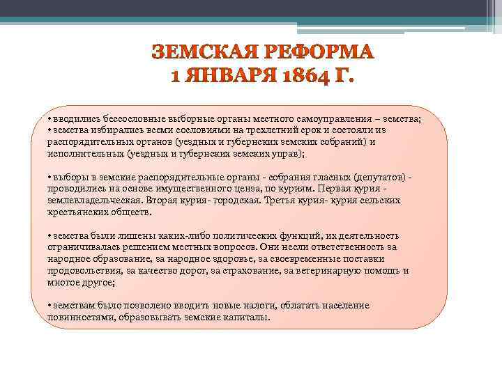 • вводились бессословные выборные органы местного самоуправления – земства; • земства избирались всеми сословиями на трехлетний срок и состояли из распорядительных органов (уездных и губернских земских собраний) и исполнительных (уездных и губернских земских управ); • выборы в земские распорядительные органы - собрания гласных (депутатов) проводились на основе имущественного ценза, по куриям. Первая курия землевладельческая. Вторая курия- городская. Третья курия- курия сельских крестьянских обществ. • земства были лишены каких-либо политических функций, их деятельность ограничивалась решением местных вопросов. Они несли ответственность за народное образование, за народное здоровье, за своевременные поставки продовольствия, за качество дорог, за страхование, за ветеринарную помощь и многое другое; • земствам было позволено вводить новые налоги, облагать население повинностями, образовывать земские капиталы.
