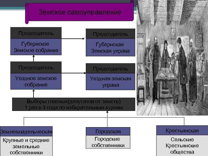 Земское самоуправление Председатель Губернское Земское собрание Губернская Земская управа Председатель Уездное земское собрание Уездная земская управа Выборы гласных(депутатов от земств) 1 раз в 3 года по избирательным куриям Землевладельческая Крупные и средние земельные собственники Городская Городские собственники Крестьянская Сельские Крестьянские общества