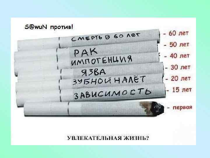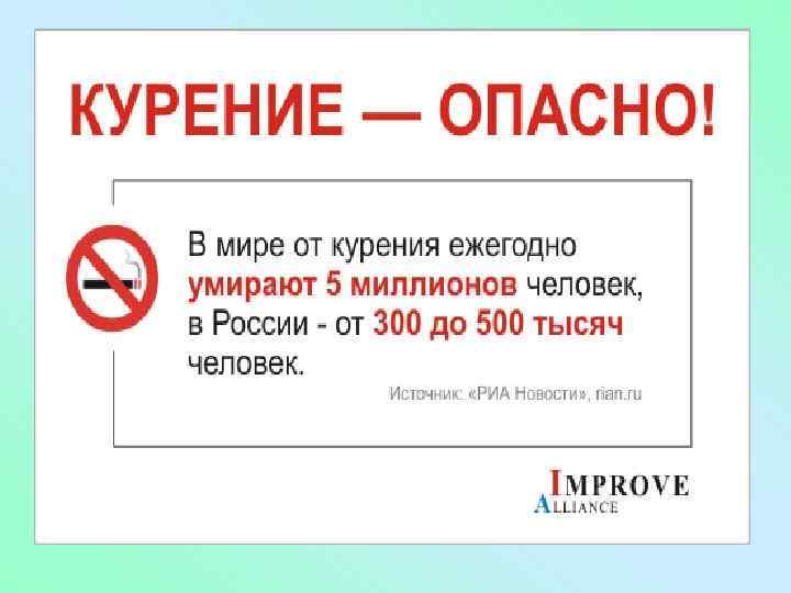 Россия. • 1)Запрет медицинским работникам курить в медицинских учреждениях в присутствии больных и учащихся медицинских училищ и институтов. • 2) больным и посетителям лечебнопрофилактических учреждений запрещено курить в палатах, столовых и в помещениях для отдыха • 3) запрет на курение в общеобразовательных школах и других учреждениях народного образования. • 4) запрет продажи сигарет несовершеннолетним и торговлю табачными изделиями вблизи школ и лечебно-профилактических учреждений. • 5) Курение запрещено также в общественном транспорте, в самолетах, в учреждениях связи, общественного питания, в кино, театрах, концертных залах, цирке.