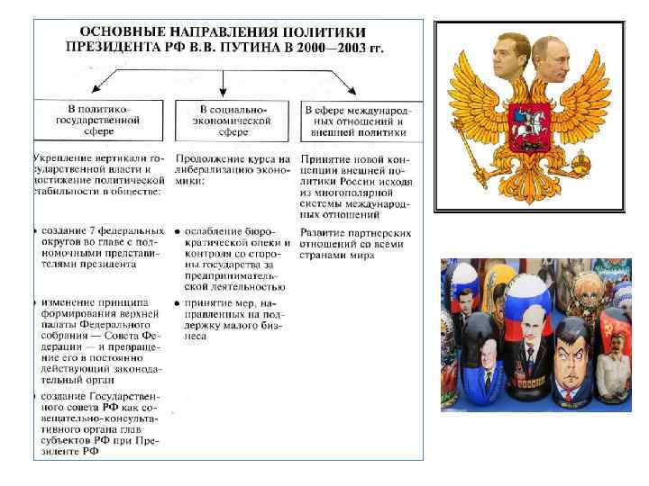 Произошли перемены в экономике. Россия начала выплачивать долги западным странам. Темпы роста экономики были колоссальными, впервые за 30 лет. Росли реальные доходы населения. Доходы бюджета превышали расходы. Проведена аграрная реформа, развивался бизнес, внедрялись новейшие технологии. Росли пенсии и зарплаты.