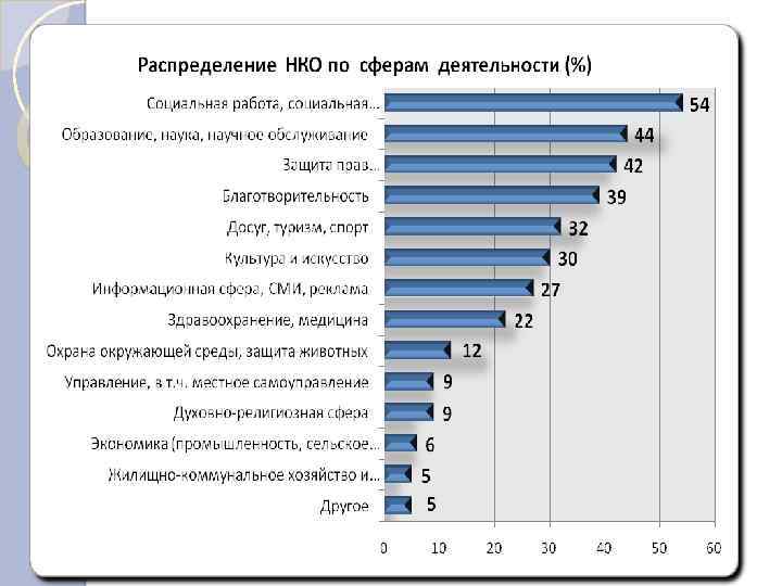 Основные сферы деятельности некоммерческих организаций, % (данные участия НКО в президентском гранте) Социальная работа, 37% социальная защита Образование и наука 35% Защита политических, экономических социальных 21% прав Досуг, туризм, спорт 19% Благотворительность 16% Культура и искусство 13% Здравоохранение 12% Информационная система, 12% СМИ Охрана окружающей среды, 6% защита животных Бытовое обслуживание 2% населения Духовно-религиозная сфера 2% Другое 21%