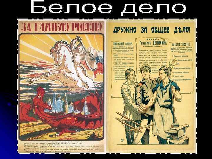 Публицисты и историки, называют следующие причины поражения белого дела: l Красные контролировали густонаселённые центральные регионы. На этих территориях было больше людей, чем на территориях, подконтрольных белым. l Регионы, которые стали поддерживать белых (например, Дон и Кубань), как правило, перед этим более других пострадали от красного террора. l Отсутствие у белых талантливых ораторов. Превосходство пропаганды красных над пропагандой белых (впрочем, некоторые историки подчёркивают, что Колчак и Деникин были разбиты войсками, состоящими из людей, которые фактически слышали только красную пропаганду) – были неискушенны в военном ремесле. l Неискушённость белых вождей в политике и дипломатии. Многие историки считают, что это стало основной причиной недостаточной помощи интервентов. На мой взгляд, основная причина победы большевиков, это отсутствие у их противников внятной политической программы. Лозунги «красных» были просты и понятны. А что говорили народу «белые» ? Созыв Учредительного собрания? Человеку тех страшных дней было как-то не до демократии. Возвращение Царя? (Монархистов средь Белого движения было мало, но именно этот лозунг ассоциировался у народа с «белыми) «Единая и неделимая Россия» ? Это не только вело «белых» к конфликту с сепаратистами, которые уже фактически полностью отделились от России (Финляндия, Польша, Прибалтика), но и было политически неоправданно – когда у человека горит своя хата, едва ли он заинтересован в сохранении каких-то там территорий… Обстоятельств было много, однако будь политика «белых» более популистской, они бы одержали победу. И кто знает, как бы тогда повернулась история…