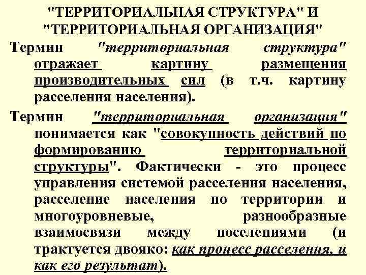 "ТЕРРИТОРИАЛЬНАЯ СТРУКТУРА" И "ТЕРРИТОРИАЛЬНАЯ ОРГАНИЗАЦИЯ" Термин "территориальная структура" отражает картину размещения производительных сил (в т. ч. картину расселения населения). Термин "территориальная организация" понимается как "совокупность действий по формированию территориальной структуры". Фактически - это процесс управления системой расселения населения, расселение населения по территории и многоуровневые, разнообразные взаимосвязи между поселениями (и трактуется двояко: как процесс расселения, и как его результат).