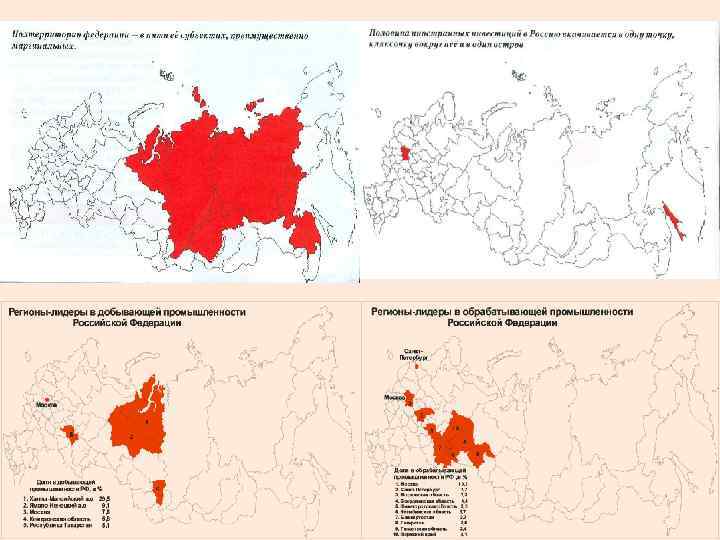 Особенности, присущие России: - классические контрасты между центром и периферией на всех уровнях (усиленные давней политикой централизма); между городом и деревней, северными и южными, западными и восточными регионами; - прочные традиции плановой экономики и сильнейшая инерция старого хозяйственного механизма (включая привычку к дешевизне сырьевых ресурсов, государственным инвестициям, гарантиям сбыта продукции и проч. – «инфантилизм» ).