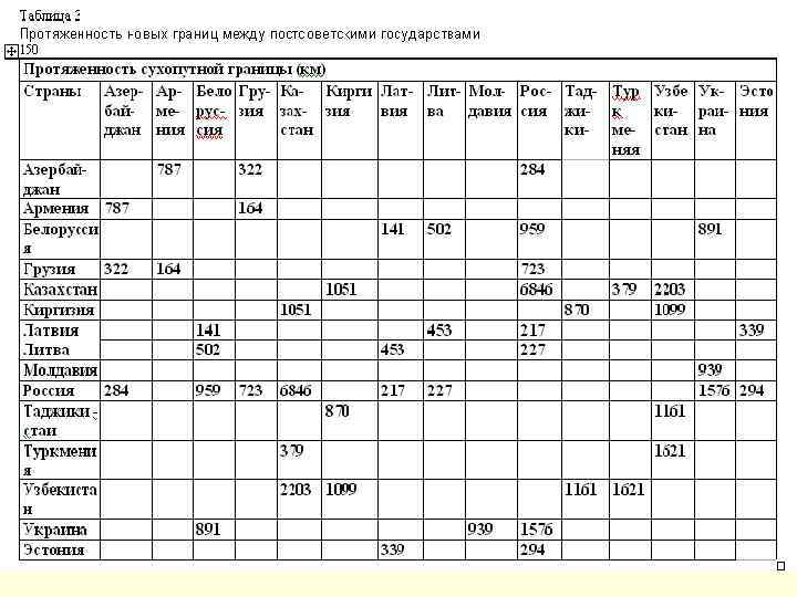 Феномен нового пограничья РФ Страна Протяженность границ с постсоветскими государствами Общая Соотношение значения протяженность столбца 2 к значению границ столбца 3 (%) Азербайджан 1393 2013 69, 2 Армения 951 1254 75 Белоруссия 2493 3098 59, 7 Грузия 1209 1461 82, 8 Казахстан 10479 12012 87, 2 Киргизия 3020 3878 77, 9 Латвия 1150 100 Литва 1182 1273 92, 9 Молдавия 939 1389 67, 6 Россия 11126 19917 55, 9 Таджикистан 2031 3651 55, 6 Туркмения 2000 3736 53, 5 Узбекистан 6084 6221 97, 7 Украина