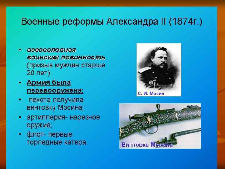 Великие реформы n n n Реформа печати - отмена предварительной цензуры (1865) Реформа образования – введение либерального университетского устава (1863) и положения о гимназиях (1864) Реформы в области финансов – учреждение Государственного банка (1860); откупная система заменялась акцизной (1860).