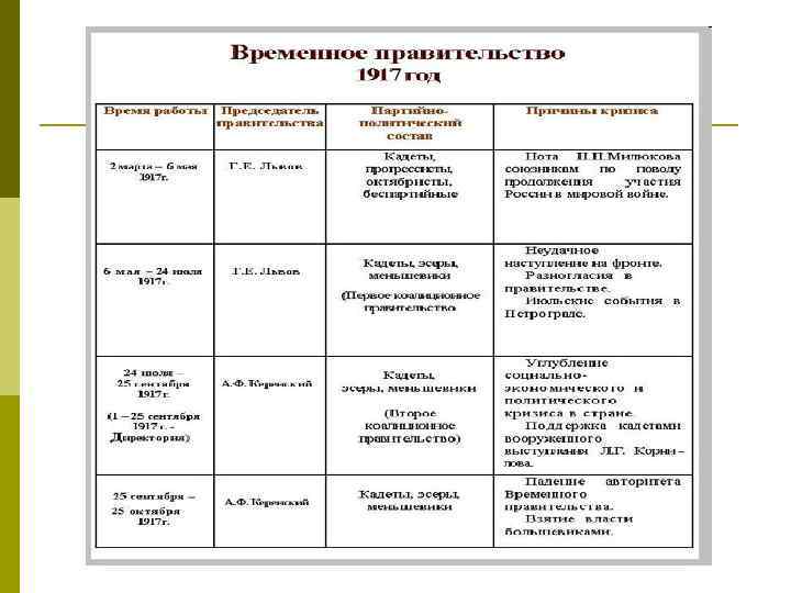 Двоевластие (февраль-июнь 1917 г) Временное правительство: амнистия политическим заключенным; свобода слова, печати; отмена религиозных и национальных ограничений; подготовка к съезду Учредительного собрания; замена полиции народной милицией; предоставление солдатам гражданских прав и др. p Советы рабочих и солдатских депутатов Приказ № 1 по Петроградскому военному округу от 1 марта 1917 г. Введение выборных солдатских комитетов; в политических выступлениях воинские части подчинялись совету p