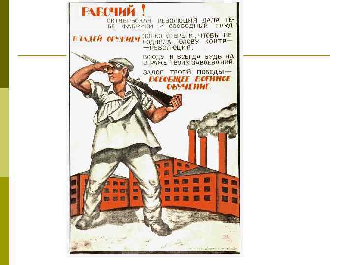 Экономическая политика p p p «Красногвардейская атака на капитал» Создание государственного сектора в экономике Создание Высшего совета народного Хозяйства (ВСНХ) «Основной закон о социализации земли» (9 февраля 1918 г. ) введение продовольственной диктатуры (Декрет от 13 мая 1918 г. ), посылка в деревню продотрядов, отбиравших «хлебные излишки» у зажиточных крестьян, ориентация на комитеты бедноты (комбеды — Декрет от 8 июня 1918 г. ) Непопулярными экономическими мерами большевики заложили основу для возникновения недовольства советской властью у значительной населения, что особенно остро проявилось в годы Гражданской войны