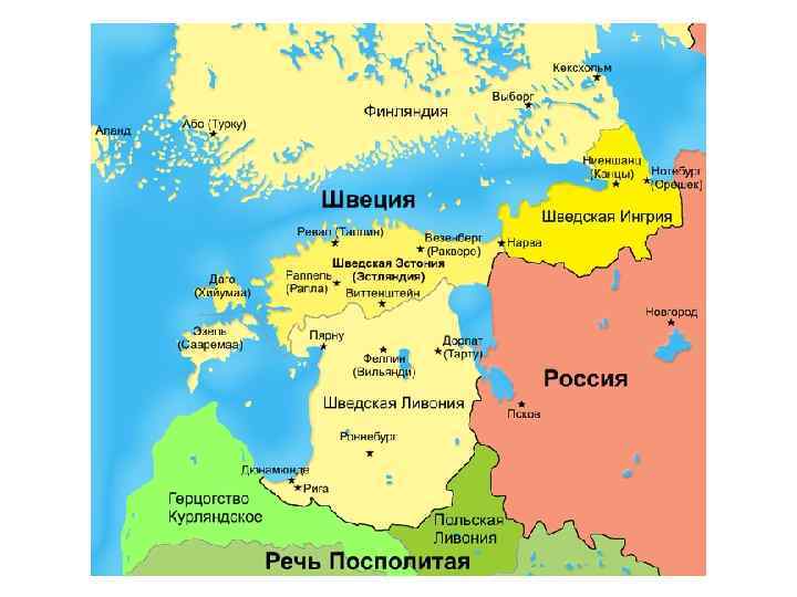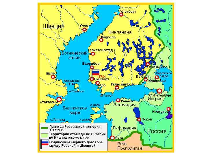 Ништадтский мир (1721) • 30 августа 1721 г. Швеция вынуждена подписать мир в г. Ништадт • Условия Ништадтского мира: – Пересмотрены условия Столбовского мира 1617 г. – Швеция признала присоединение к России Лифляндии, Эстляндии, Ингерманландии (совр. Ленинградск. обл. ), части Карелии, т. е. всё восточное побережье Балтийского моря • Россия добилась выхода к Балтийскому морю