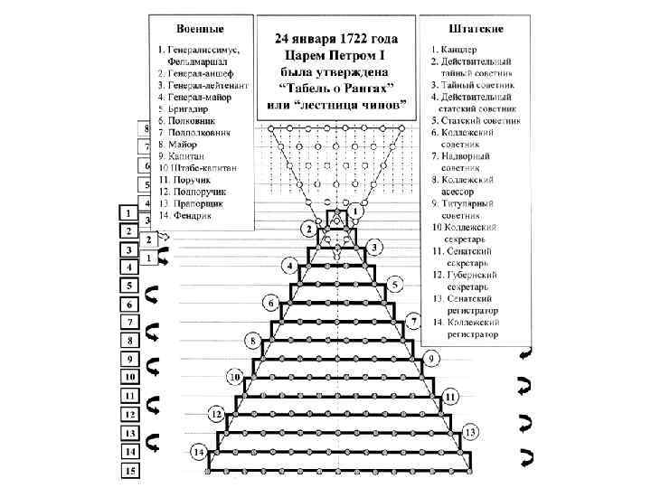 Табель о рангах (1722) • Разделение военной, гражданской и придворной службы на 14 рангов. • Служба начиналась с низшего 14 ранга • Для достижения высшего ранга – пройти последовательно все ранги • При достижении 8 ранга любой чиновник/военный мог получить статус потомственного дворянства. • Принцип личной выслуги окончательно вытесняет родовитость. А указами 1712, 1714 и 1719 гг. был установлен порядок, по которому "родовитость" не принималась во внимание при назначении на должность и прохождении службы.