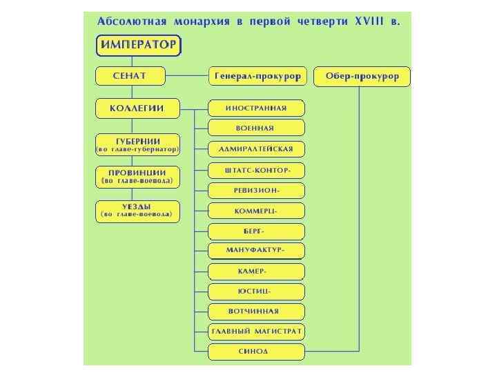 Коллегии (1718) • В 1717 -1721 гг. приказы были упразднены и заменены коллегиями. • Каждая коллегия ведала определённой отраслью: – – – – Коллегия иностранных дел - внешние отношения; Военная коллегия - сухопутные силы; Адмиралтейская - флот; Камер-коллегия - сбор доходов; Штатс-контор-коллегия - расходы государства; Вотчинная - дворянское землевладение; Мануфактур-коллегия - промышленность Берг-коллегия – горно-металлургическая отрасль Ревизион-коллегия - контроль поступления доходов, сбор податей, налогов, пошлин, правильность расходования учреждениями отпущенных им сумм, Юстиц-коллегия – гражданское судопроизводство, Коммерц-коллегия – вопросы судоходства, таможни и торговли. Главный магистрат – контроль на магистратами (городские органы самоуправления) Синод – Духовная коллегия • Принятие решения – коллегиальное, а не единоначальное.