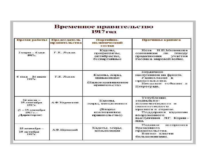 Партия большевиков • Курс на социалистическую революцию – свержение Временного правительства, немедленный мир и раздача земли крестьянам