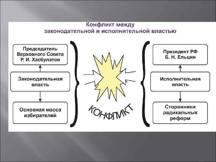 Хронология противостояния ü ü ü 21 сентября 1993 года — Президент подписал указ № 1400 «О поэтапной конституционной реформе в Российской Федерации» , предписывавший Верховному Совету Российской Федерации и Съезду народных депутатов прекратить свою деятельность, вводилась в действие временная система органов власти, на 11— 12 декабря назначены выборы в Государственную Думу. 21— 22 сентября 1993 года — Конституционный Суд Российской Федерации выносит заключение о неконституционности действий Президента, Верховный Совет принимает решение о прекращении полномочий Президента Ельцина и переходе их к вице-президенту А. В. Руцкому, 23 сентября 1993 года открывается X (Чрезвычайный) Съезд народных депутатов, который, при наличии необходимого кворума, утверждает постановления КС о прекращении президентских полномочий Ельцина и переходе их к вице-президенту Руцкому, а действия Ельцина квалифицирует как попытку «государственного переворота» . 3— 4 октября 1993 года — после захвата сторонниками Верховного Совета здания мэрии Москвы на Новом Арбате, попытки вооруженного захвата ими телецентра в Останкино, Президент вводит чрезвычайное положение в Москве, Белый Дом штурмуют с применением бронетехники. 12 декабря 1993 — состоялось всенародное голосование по Конституции России, в ходе которого за Конституцию проголосовали 58 процентов участников референдума, а также выборы в Совет Федерации и Государственную Думу первого созыва