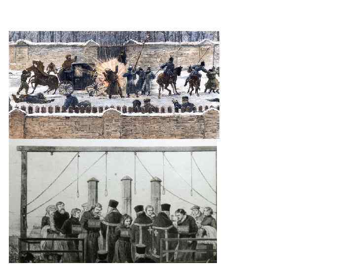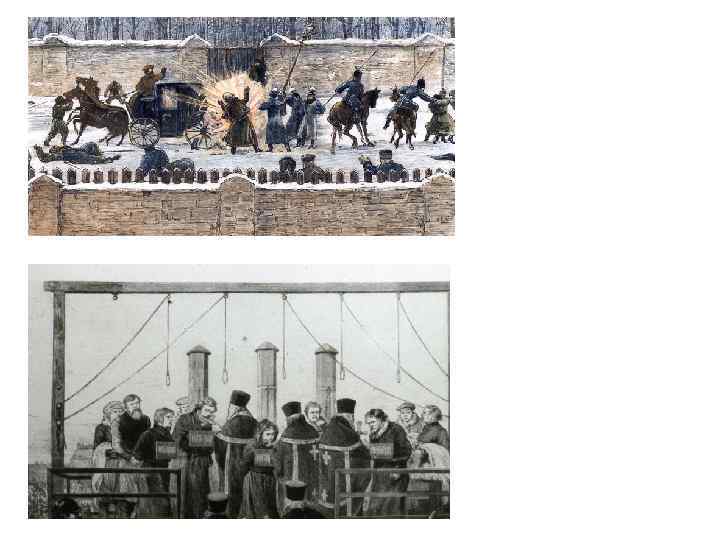 Сторонники террора создают организацию «Народная воля» . Желябов, Михайлов, Перовская, Фигнер. Организация тайных обществ, индивидуальный террор против правительства, организация переворота. Было совершено 5 покушений на Александра II.