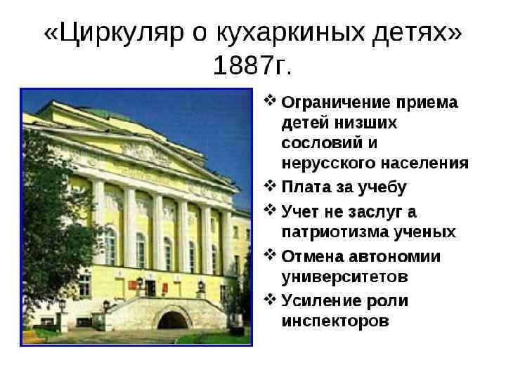 «Манифест о незыблемости самодержавия» и «Распоряжение об усиленной охране» – символы Контрреформ. Принятое в августе 1881 года как временный закон на три года, оно так и осталось временным - до самого падения монархии, каждые три года продлеваясь на новый срок. В любой местности могло быть объявлено чрезвычайное положение, а любой её житель - арестован, отдан военному суду или сослан без суда на 5 лет. Местные власти при этом получали право закрывать учебные, торговопромышленные предприятия, приостанавливать деятельность земств и городских дум, закрывать органы печати.