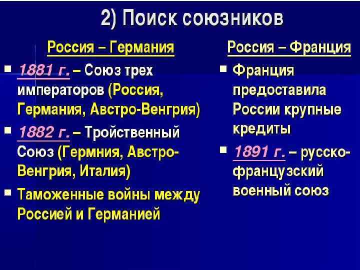 • Сан-Стефанский мирный договор. Берлинский конгресс. Тройственный союз. Русско-французский союз. • Россия на рубеже ХIХ - XX вв. Российская экономика конца XIX – начала ХХ вв. Форсирование российской индустриализации. Реформы С. Ю. Витте. Аграрный вопрос. Капитализм и сельское хозяйство. Кризис 1900 -1903 гг. Черты империализма. Монополии. «Союз борьбы за освобождение рабочего класса» . • Русско-японская война и ее последствия (1904 -1905). Обострение кризиса самодержавия и первая российская революция (1905 -1907). Портсмутский мир. Влияние поражения в русско-японской войне на внутреннее положение Российской Империи. Столыпинские реформы: сущность, проблемы, последствия. Опыт парламентаризма. Итоги и уроки революции и реформ. Экономическое развитие России до 1913 года. • Этапы и предпосылки, характер и задачи первой русской революции. Советы. Политические партии и организации. Программы политических партий. Государственная Дума. Специфика российского парламентаризма. Третьеиюньская политическая система. Столыпинские реформы. Русская крестьянская община.