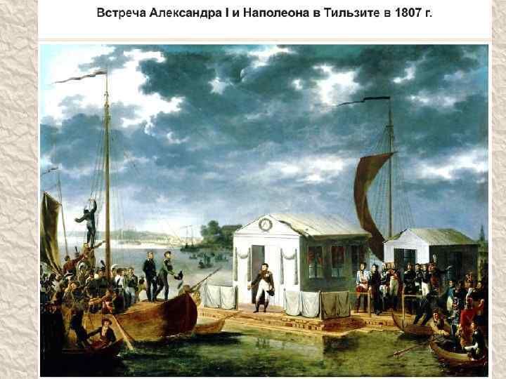 Тильзитский мир Встреча Александра и Наполеона на Немане. Александр I вынужден был пойти на переговоры с Наполеоном. Получив предложение царя о перемирии, Наполеон ответил, что желает не только мира, но и союза с Россией. Александр согласился: «Союз Франции с Россией постоянно был предметом моих желаний» . 13(25) июня императоры встретились на плоту на Немане близ Тильзита и совещались наедине более двух часов. Переговоры продолжались до 25 июня (7 июля) 1807 г.