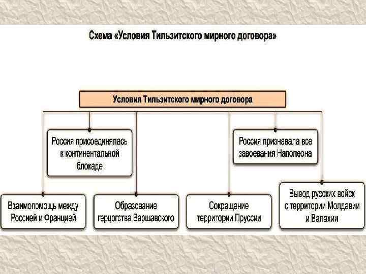 Тильзитский мир ? Какое из условий Тильзитского мира было самым тяжелым для России и почему? Обязательство участвовать в континентальной блокаде, разорительной для российского дворянства и купечества. Наполеон, Александр I, королева Пруссии Луиза и король Фридрих-Вильгельм III в Тильзите.