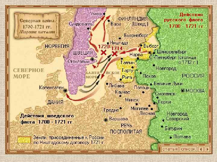 Завершение Северной войны 30 августа 1721 г. Заключение Ништадтского мирного договора Основные условия: Россия получала территории Прибалтики (Лифляндия, Эстляндия, Ингерманландия), часть Карелии и выход в Балтийское море. Россия обязывалась уплатить Швеции денежную компенсацию и возвратить Финляндию.