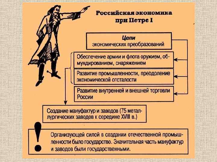 Экономические реформы: Создание мануфактурной промышленности. Осуществление в экономической сфер государственной политики меркантилизма и протекционизма. Активное вмешательство государства торговую деятельность русского купечества: гос. монополия на продажу ряда товаров; принудительное переселение купцов в новую столицу, большие налоги.
