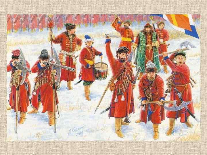 1682 г – СТРЕЛЕЦКИЙ БУНТ ПЁТР I (1682 -1725 гг) ИВАН V (1682 -1696 гг) Царица Наталья Кирилловна показывает Ивана V стрельцам, чтобы доказать, что он жив-здоров. Картина Н. Д. Дмитриева. Оренбургского Мятеж стрельцов в 1682. Стрельцы выволакивают из дворца Ивана Нарышкина. Пока Пётр I утешает мать, царевна Софья наблюдает с удовлетворением. Картина А. И. Корзухина, 1882