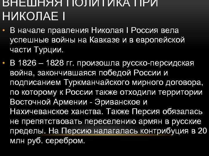 ВНЕШНЯЯ ПОЛИТИКА ПРИ НИКОЛАЕ I • В начале правления Николая I Россия вела успешные войны на Кавказе и в европейской части Турции. • В 1826 – 1828 гг. произошла русско-персидская война, закончившаяся победой России и подписанием Туркманчайского мирного договора, по которому к России также отходили территории Восточной Армении - Эриванское и Нахичеванское ханства. Также Персия обязалась не препятствовать переселению армян в русские пределы. На Персию налагалась контрибуция в 20 млн руб. серебром.
