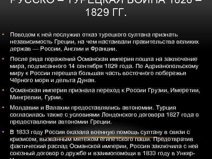 РУССКО – ТУРЕЦКАЯ ВОЙНА 1828 – 1829 ГГ. • Поводом к ней послужил отказ турецкого султана признать независимость Греции, на чем настаивали правительства великих держав — России, Англии и Франции. • После ряда поражений Османская империя пошла на заключение мира, подписанного 14 сентября 1829 года. По Адрианопольскому миру к России перешла большая часть восточного побережья Чёрного моря и дельта Дуная. • Османская империя признала переход к России Грузии, Имеретии, Мингрелии, Гурии. • Молдавии и Валахии предоставлялись автономии. Турция согласилась также с условиями Лондонского договора 1827 года о предоставлении автономии Греции. • В 1833 году Россия оказала военную помощь султану в связи с кризисом, вызванным мятежом египетского паши. Предотвратив фактический распад Османской империи, Россия заключила с ней союзный договор о дружбе и взаимопомощи в 1833 году в Ункяр-