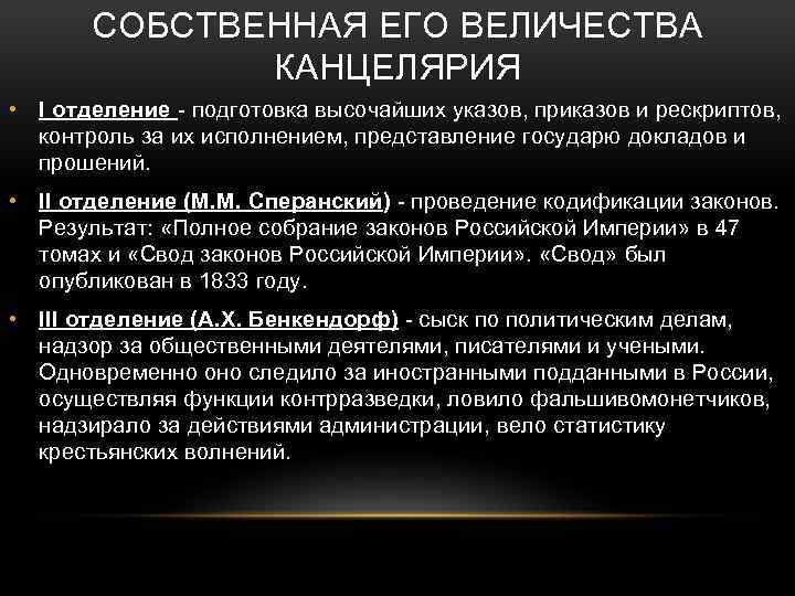 СОБСТВЕННАЯ ЕГО ВЕЛИЧЕСТВА КАНЦЕЛЯРИЯ • I отделение - подготовка высочайших указов, приказов и рескриптов, контроль за их исполнением, представление государю докладов и прошений. • II отделение (М. М. Сперанский) - проведение кодификации законов. Результат: «Полное собрание законов Российской Империи» в 47 томах и «Свод законов Российской Империи» . «Свод» был опубликован в 1833 году. • III отделение (А. Х. Бенкендорф) - сыск по политическим делам, надзор за общественными деятелями, писателями и учеными. Одновременно оно следило за иностранными подданными в России, осуществляя функции контрразведки, ловило фальшивомонетчиков, надзирало за действиями администрации, вело статистику крестьянских волнений.