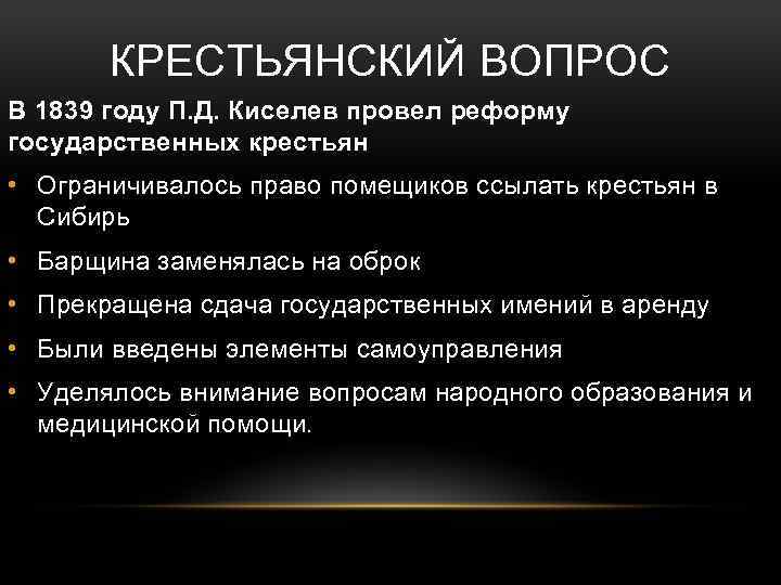 КРЕСТЬЯНСКИЙ ВОПРОС В 1839 году П. Д. Киселев провел реформу государственных крестьян • Ограничивалось право помещиков ссылать крестьян в Сибирь • Барщина заменялась на оброк • Прекращена сдача государственных имений в аренду • Были введены элементы самоуправления • Уделялось внимание вопросам народного образования и медицинской помощи.