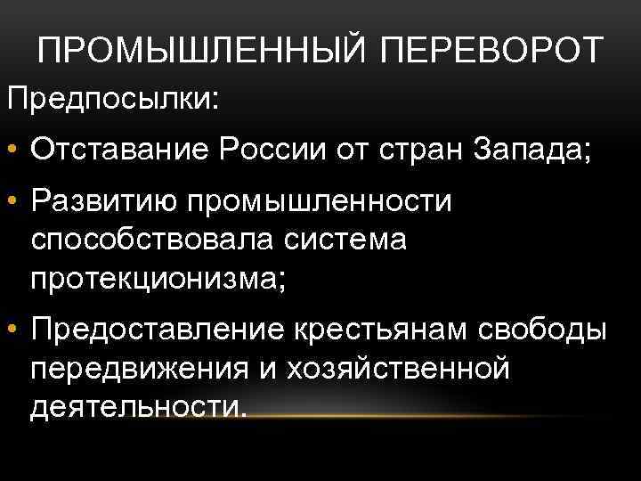 ПРОМЫШЛЕННЫЙ ПЕРЕВОРОТ Предпосылки: • Отставание России от стран Запада; • Развитию промышленности способствовала система протекционизма; • Предоставление крестьянам свободы передвижения и хозяйственной деятельности.
