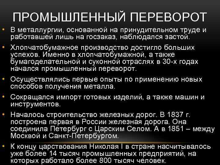 ПРОМЫШЛЕННЫЙ ПЕРЕВОРОТ • В металлургии, основанной на принудительном труде и работавшей лишь на госзаказ, наблюдался застой. • Хлопчатобумажное производство достигло больших успехов. Именно в хлопчатобумажной, а также бумагоделательной и суконной отраслях в 30 -х годах начался промышленный переворот. • Осуществлялись первые опыты по применению новых способов получения металла. • Сокращался импорт готовых изделий, а также машин и инструментов. • Началось строительство железных дорог. В 1837 г. построена первая в России железная дорога. Она соединила Петербург с Царским Селом. А в 1851 – между Москвой и Санкт-Петербургом. • К концу царствования Николая I в стране насчитывалось уже более 14 тысяч промышленных предприятий, на которых работало более 800 тысяч человек.