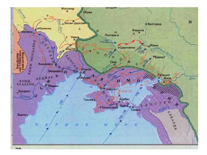 Внешняя политика во второй четверти XVIII в. Основными ее направлениями в XVIII в. Оставались борьба со Швецией, укрепление позиций в Центральной Европе и войны с Турцией за выход к Черному и Средиземному морям. Русско-турецкая война 1735 – 1739 гг. В 1736 году русская армия взяла Бахчисарай (Крым) и Азов. , в следующем году Очаков. В 1739 г. Османы были разбиты под Ставучанами. Австрия после ряда поражений пошла на сепаративный мир с Турцией и Россия вынуждена была подписать Белградский мирный договор, по которому России перешли Азов (без укреплений) и небольшая территория между Северным Донцом и Бугом. Выход к морю остался за Турцией.