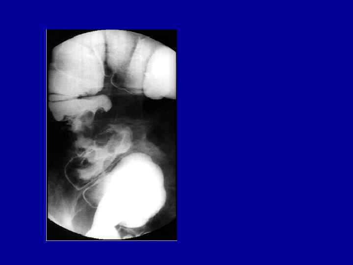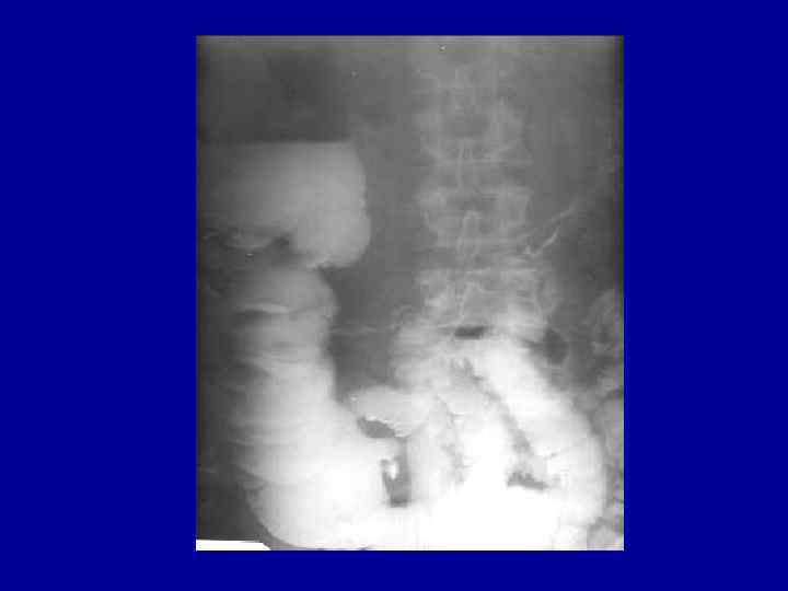Контрастное исследование желудочно-кишечного тракта применяется при затруднениях в диагностике кишечной непроходимости. Контрастную смесь можно вводить как перорально, так и ректально (рис 6). Бариевую взвесь в количестве 50 мл вводят через рот. После дачи контраста больного укладывают на 30 минут на правый бок для более быстрого прохождения введеного вещества через привратник. Далее производят рентгеновские снимки каждые 3060 минут. Контраст быстро, в течение 20 -60 минут, достигает места обтурации, где он задерживается. Время транзита контраста до слепой кишки обычно у здорового равно 2 -3 часам, при паралитической непроходимости 3 -4 часам. Если контраст задерживается более 4 -х часов, то можно предполагать механическую непроходимость. После дачи контраста необходимо следить не только за его продвижением, но и за появлением дефектов наполнения, за сужениями просвета и т. д. С помощью контрастной клизмы при ОКН можно получить ряд характерных признаков, но её можно применять только в ранних стадиях заболеания, пока не наступили деструктивные изменения кишечной стенки.