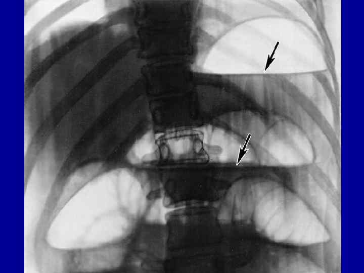 Чаши Клойбера • Чаша Клойбера – горизонтальный уровень жидкости с куполообразным просветлением над ним, что имеет вид перевернутой вверх дном чаши. При странгуляционной непроходимости могут проявляться уже через 1 час, а при обтурационной непроходимости - через 3 -5 часов с момента заболевания. При просвечивании видно, как уровень жидкости колеблется при перемене положения больного. Такие чаши образуются в кишечнике не сразу, а по истечении некоторого времени в зависимости от степени ущемления или обтурации кишки и вида непроходимости. По мере нарастания в кишечной стенке деструктивных изменений, сопровождающихся понижением тонуса, высота газовых пузырей уменьшается, а длина уровней увеличивается. Количество чаш может быть различным 1 -2, а иногда 12 -15 и более, при этом уровни наслаиваются один на другой в виде ступенчатой лестницы.