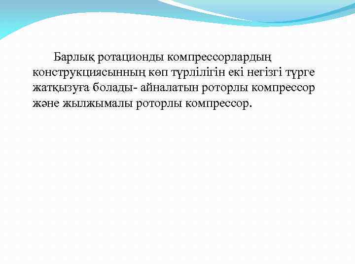Барлық ротационды компрессорлардың конструкциясынның көп түрлілігін екі негізгі түрге жатқызуға болады- айналатын роторлы компрессор және жылжымалы роторлы компрессор.