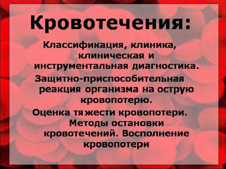 ОМПЛЕКСНАЯ ГЕМОСТАТИЧЕСКАЯ ТЕРАПИЯ • Заместительная терапия (замещение ОЦК и массы эритроцитов). При проведении заместительной терапии прежде всего следует учитывать объем кровопотери • Собственно гемостатическая терапия (использование химических и биологических методов общего действия) • Борьба с ацидозом (переливание 150 -300 мл 4% раствора соды) • Симптоматическая терапия, направленная на поддержание функции основных органов и систем организма (прежде всего сердечнососудистой, легких и почек).