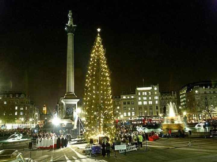 • В начале декабря традиционная елка высотой 20 метров доставляется из Осло в Лондон и устанавливается к Рождеству на Трафальгарской площади. Такая традиция существует с 1946 года. Рождественскую елку присылает в Англию королевская семья Норвегии в знак признательности за помощь, которую Британцы оказали Норвегии во время второй мировой войны. Тогда в Лондоне жила норвежская королевская семья, а британские военные принимали участие в освобождении Норвегии от немецкой оккупации.