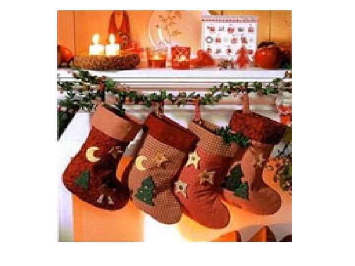 • С Викторианской Англией связан обычай складывать подарки в Рождественский носок. В то время рассказывали сказку, что «Рождественский дед» путешествовал по воздуху и проникал в дома через дымовую трубу. Спускаясь в один из домов, он обронил несколько золотых монет в носок, который повесили сушиться над очагом. С тех пор в Рождественский сочельник на камин стали вывешивать «носки и чулки в надежде, что туда чтонибудь упадет» . И сейчас в канун Рождества дети вешают на камин или край кровати рождественский чулок, чтобы Санта Клаус наполнил его подарками. Эта традиции постепенно приживается и у нас, в России.