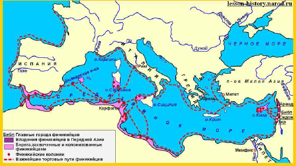 Северное море Остров Ирландия и алт Б е ско й Условные обозначения е ор м Владения финикийцев в Передней Азии Остров Великобритания Города-метрополии финикийцев Морские торговые пути финикийцев Азовское море Черное море остров Корсика Пиренейский полуостров Балеарские острова Апеннинский полуостров Балканский полуостров Сардиния Афины Карфаген Берега, захваченные и колонизированные финикийцами Рим полуостров Малая Азия остров Сицилия Средиземное море река Тигр остров Крит остров Кипр Арвад Библ Сидон Тир Иерусалим Мемфис река Нил Города-колонии финикийцев река Евфрат Карфаген – важнейшая колония финикийцев