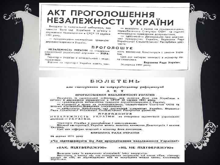 Текст Постанови ВР УРСР «Про проголошення незалежності України» П О С Т А Н О В А ВЕРХОВНОЇ РАДИ УКРАЇНСЬКОЇ РСР Про проголошення незалежності України (Відомості Верховної Ради (ВВР) 1991, N 38, ст. 502) v Верховна Рада Української Радянської Соціалістичної Республіки п о с т а н о в л я є: v Проголосити 24 серпня 1991 року Україну незалежною демократичною державою. v З моменту проголошення незалежності чинними на території України є тільки її Конституція, закони, постанови Уряду та інші акти законодавства республіки. v 1 грудня 1991 року провести республіканський референдум на підтвердження акта проголошення незалежності. Голова Верховної Ради Української РСР Л. Кравчук м. Київ, 24 серпня 1991 року N 1427 -XII