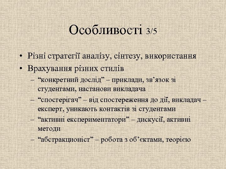 Особливості 3/5 • Різні стратегії аналізу, сінтезу, використання • Врахування різних стилів – “конкретний дослід” – приклади, зв’язок зі студентами, настанови викладача – “спостерігач” – від спостереження до дії, викладач – експерт, уникають контактів зі студентами – “активні експериментатори” – дискусії, активні методи – “абстракционіст” – робота з об’єктами, теорією