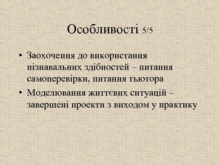 Особливості 5/5 • Заохочення до використання пізнавальних здібностей – питання самоперевірки, питання тьютора • Моделювання життєвих ситуацій – завершені проекти з виходом у практику