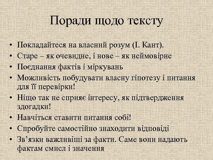 Поради щодо тексту • • Покладайтеся на власний розум (І. Кант). Старе – як очевидне, і нове – як неймовірне Поєднання фактів і міркувань Можливість побудувати власну гіпотезу і питання для її перевірки! Ніщо так не сприяє інтересу, як підтвердження здогадки! Навчіться ставити питання собі! Спробуйте самостійно знаходити відповіді Зв’язки важливіші за факти. Саме вони надають фактам смисл і значення