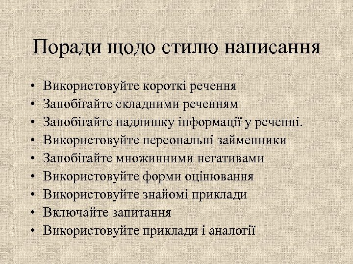 Поради щодо стилю написання • • • Використовуйте короткі речення Запобігайте складними реченням Запобігайте надлишку інформації у реченні. Використовуйте персональні займенники Запобігайте множинними негативами Використовуйте форми оцінювання Використовуйте знайомі приклади Включайте запитання Використовуйте приклади і аналогії