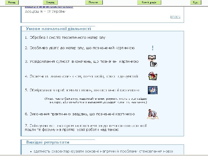 Вимоги до проектування тексту • • • Відповідність цілям і задачам навчання Активність та інтерактивність Відповідність стилям навчання Смислова закінченість певного блоку тексту Структурованість блоків тексту Засоби для забезпечення інтересу і принадності змісту • Стиль мовної організації • Схеми окремих блоків тексту і визначення взаємозв’язків
