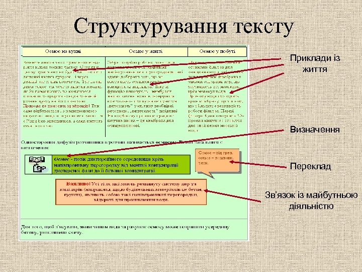 Структурування тексту Приклади із життя Визначення Переклад Зв’язок із майбутньою діяльністю